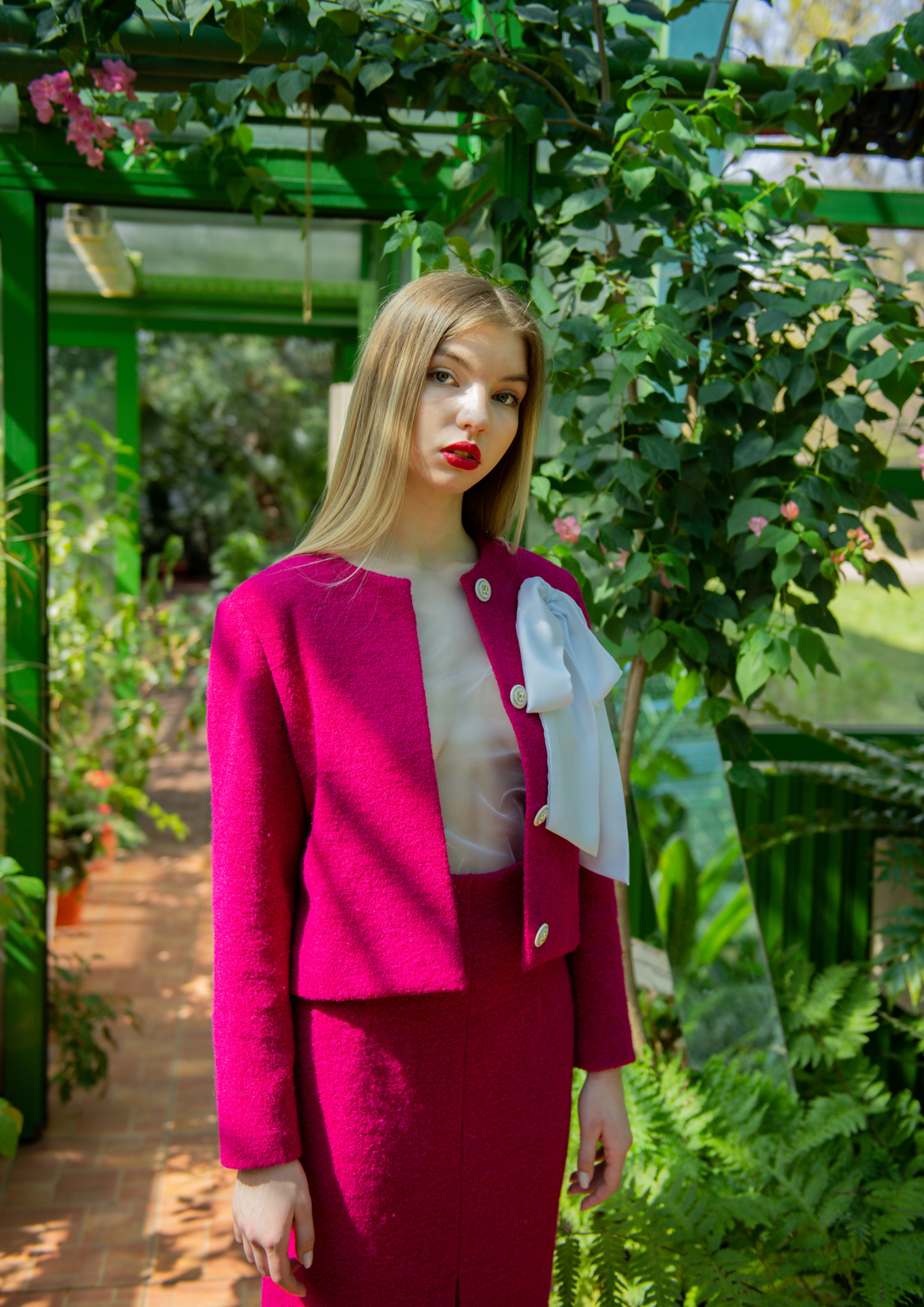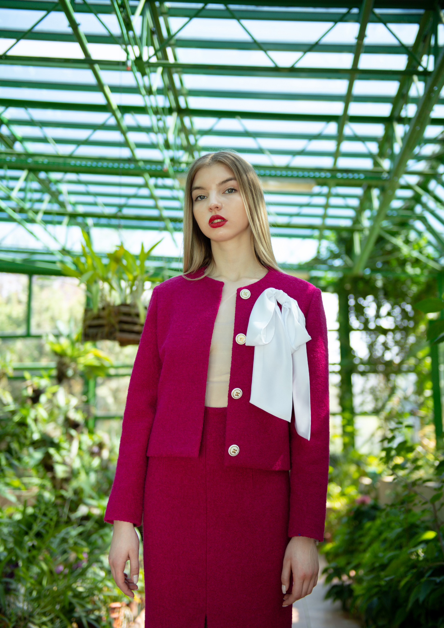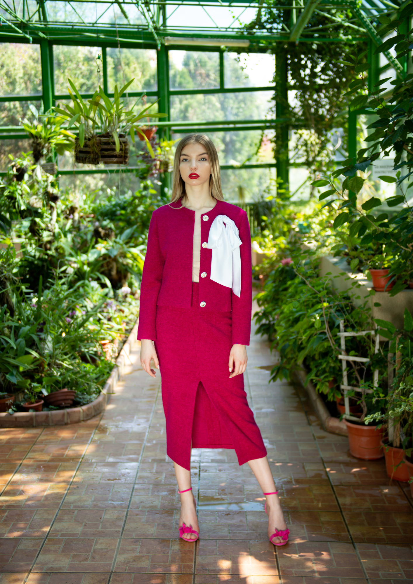 - Un costum in doua piese, sacou clasic captusit, accesorizat cu nasturi bijuterie si o brosa cu funda, pe care o puteti prinde dupa viziunea fiecareia si fusta trei sferturi, conica cu o crapatura sexy, dar intr-o nota eleganta.